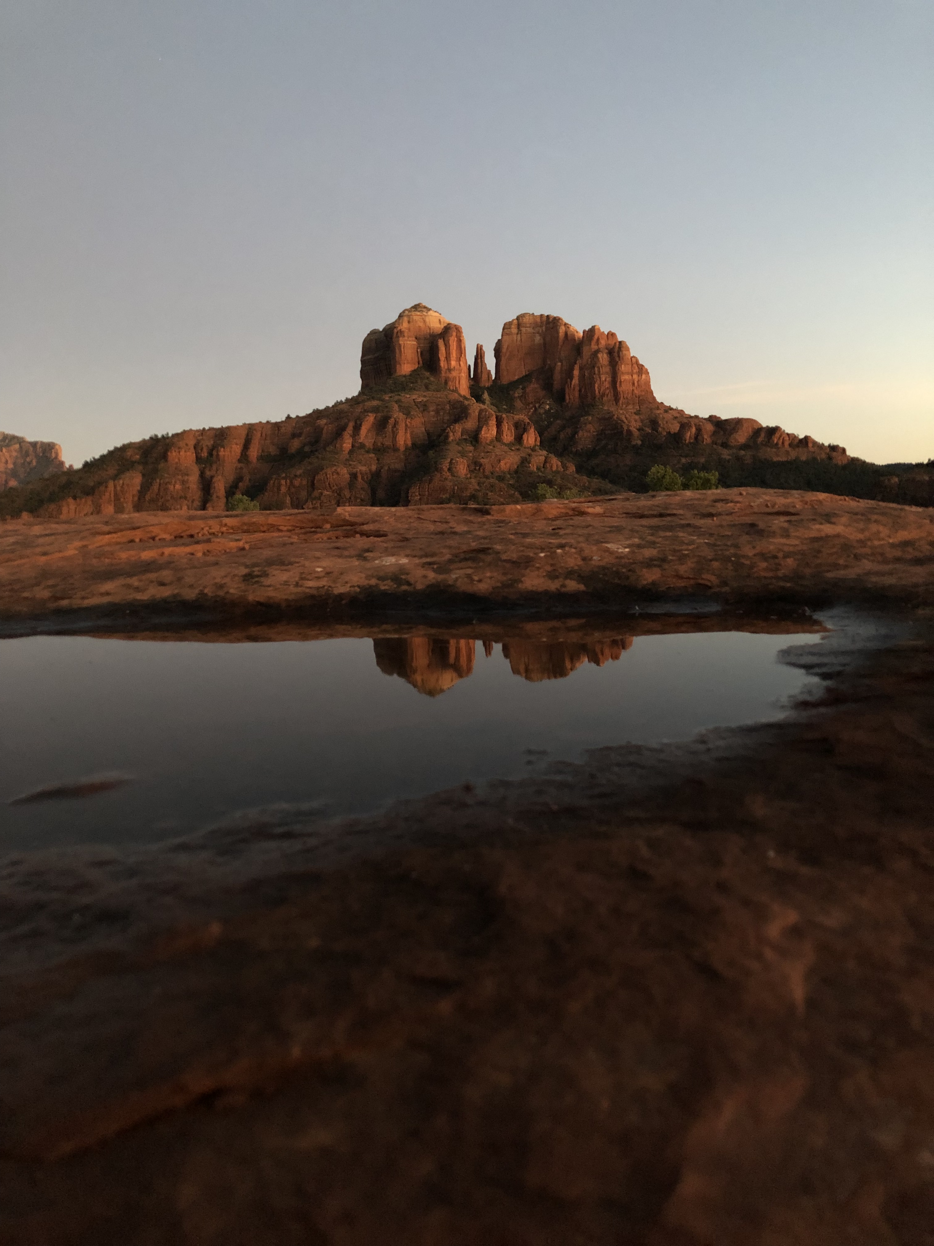 We built cairns of our own. Not exactly sure what we were doing, but busing ourselves with finding rocks that would balance on top of each rock one at a time, not saying a word while we built each one. We ended our trip trying to find a spot by cathedral rock that was closed but ended up walking down the Secret Slide Rock at dusk recommended by a passerby. At this spot, you can catch Cathedral Rock reflected in tiny pools on slide rock. We lay there side by side on the cold, smooth red rock chilling our bellies, looking at the reflection in the ponds and the full moon above us. I put my arm around her as we took a picture and reflected on the reflection.