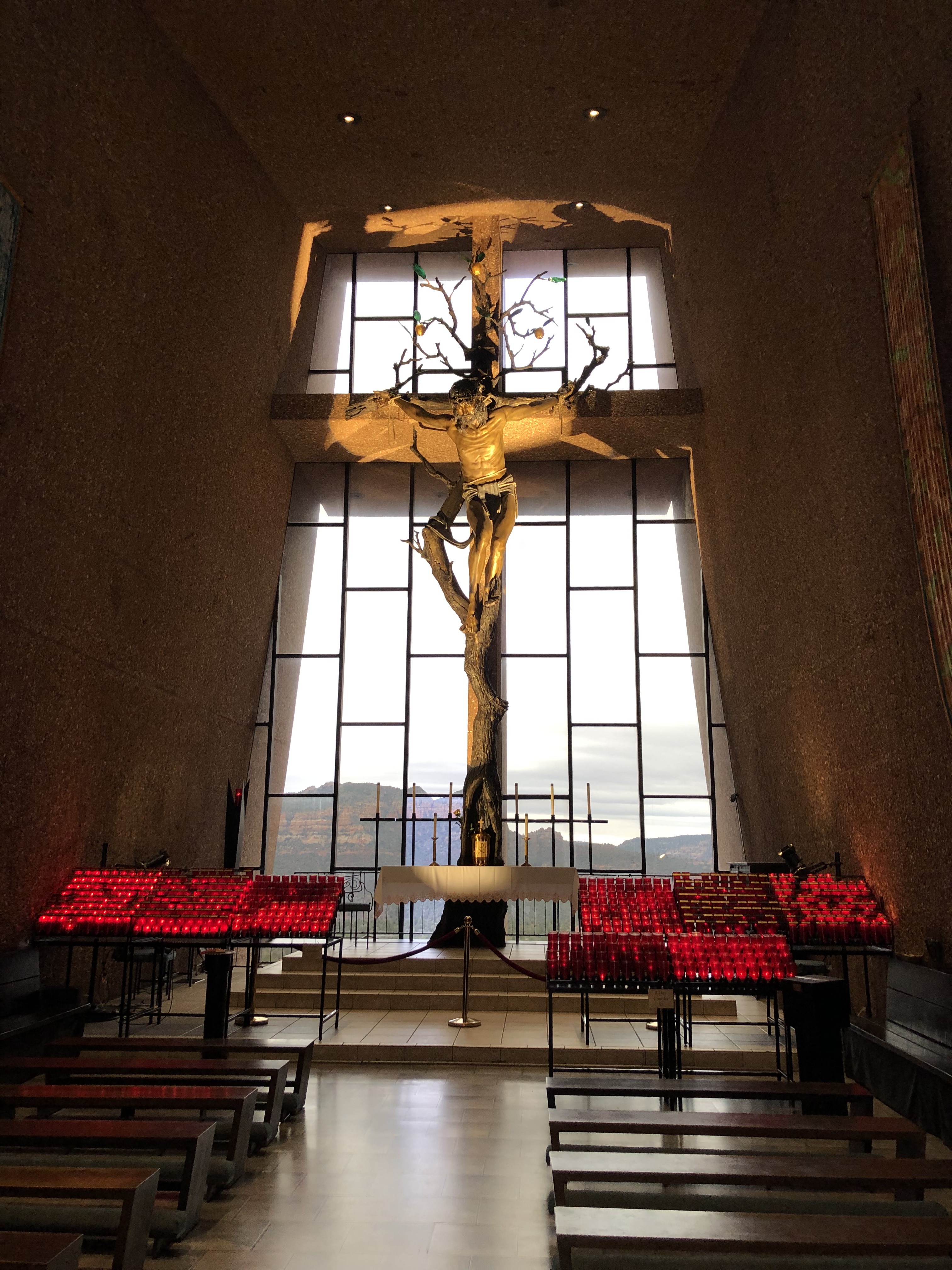 We checked into our hotel with the view of Bell Rock, Bell also the nickname of my oldest daughter coincidentally, and then headed to the Chapel of the Holy Cross. It was breath-taking, built in the side of the red rocks, illuminating the cliffside. Just a small chapel with a view of the canyon and a beautiful crucifixion statue in front of it. I went in to light a candle for each of my family members. I am not Catholic so I wasn’t sure of the proper way of doing it. I about lit my finger on fire while trying to light 8 candles while saying a prayer for each one. I then noticed they had three-day candles (donation of $5 for each and the little ones were $1). All I had left in my pocket was $2, I had put the rest in the other donation bucket. I figured God knew what was up, so I lit the three-day candle for my daughter. As I looked at the crucifixion, I felt a feeling of Grace and love.