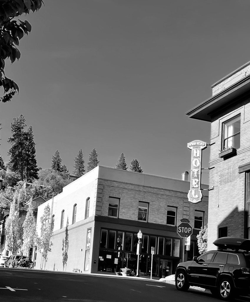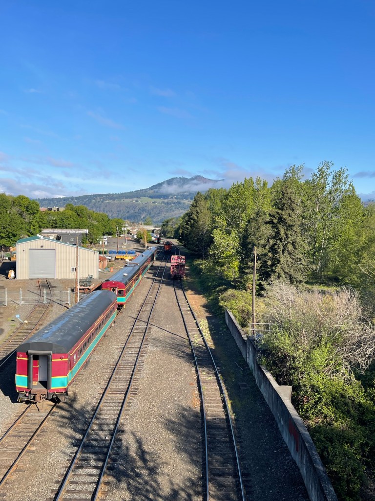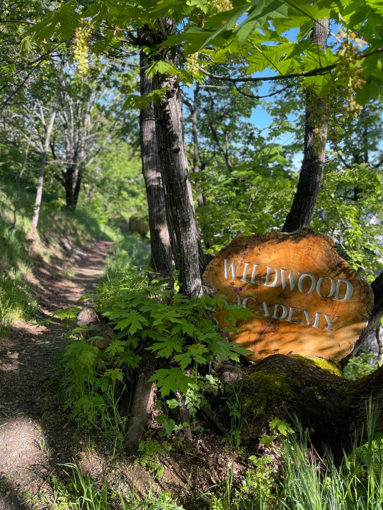 I carried my borrowed mug of Folgers coffee and meandered down the hill towards the train station. During the weekdays the train brings Portlanders around the mountain or tourists to experience the fruit loop, the local breweries, wineries or for the braver sort, to try their luck at kite boarding or wind surfing. The deserted train station looked ominous with outdoor buildings missing walls. Instead of walking down the sidewalk I decided to take the trail through the train yard. In hindsight, I probably shouldn’t have been walking alone through the woods but it appeared like a shortcut to the cafe and a much needed morning espresso. A few steps down the path brought stairs that marked “The Ruins” it seemed a bit dark being only a stones throw from the souvenir shop at the train station. A few more yards brought another rustic wood sign on a tree announcing a school. Where was the school? I soon found myself daydreaming about a portal similar to Hogwarts where the ruins lead to the infamous school for the secret society found only among the trees behind the abandoned cars. Stringed lights were hung across the partially standing roofless walls at a desperate attempt to dress up the platform as an outdoor BOHO, Shabby Chic gathering spot. It all seemed strange as I popped out from the wooded path onto the busy sidewalk where the cafe proclaimed caffeine and my life’s blood.